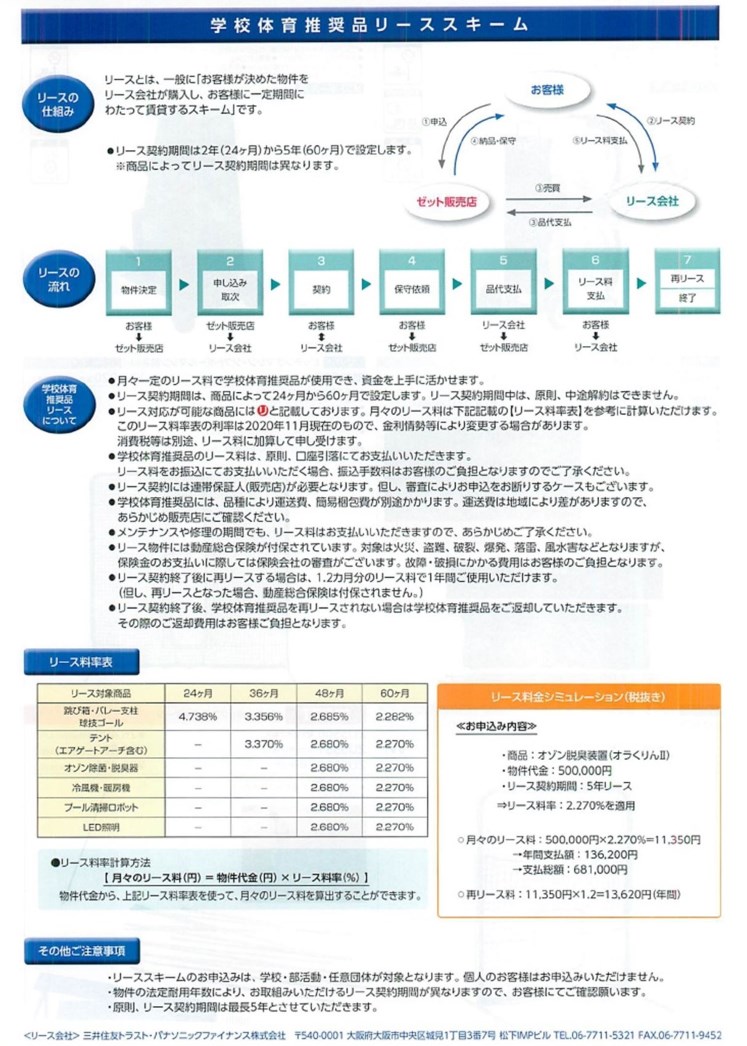 ZETT社は体育器具全般を扱っています。しかしすべてがリース可能というわけではなく、跳箱・ゴール・テント・オゾン除菌・冷風機・プール清掃ロボット・LED照明など大型・高額なものに限られています。
